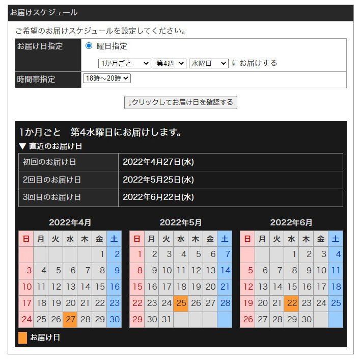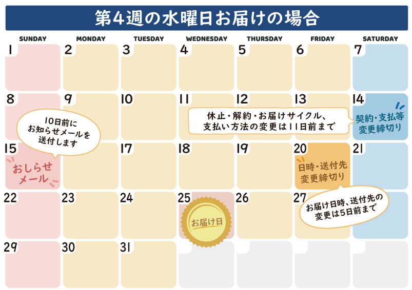 各月の第4週~最終週の水・木・金・土・日からご希望日をお選びいただけます。(2回目以降は発送の10日前にお知らせメールをお送りします)