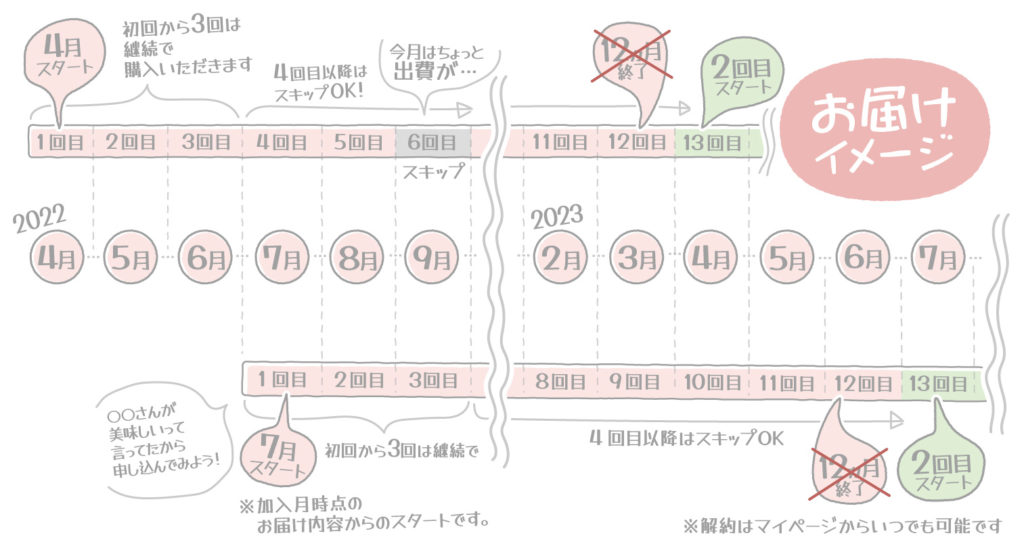 3回目までは毎月のお届けとなります。4回目以降は、お届け予定日の11日前までにマイページから手続きをお願いいたします。