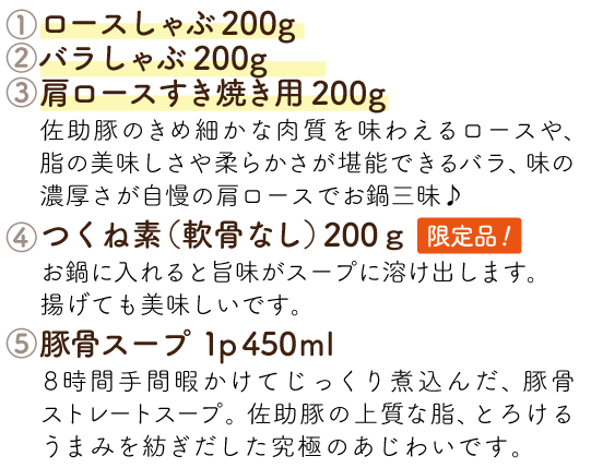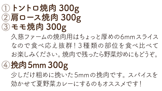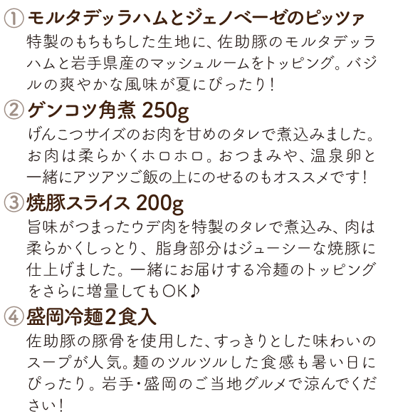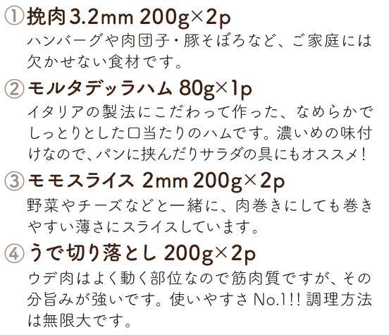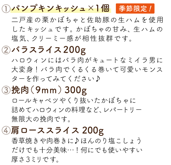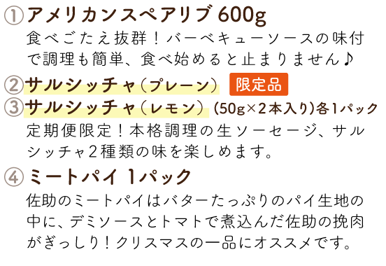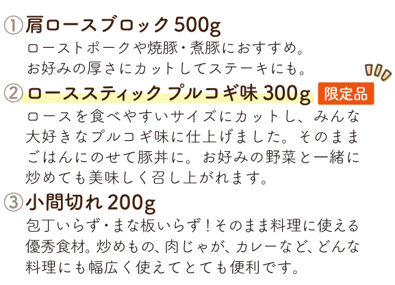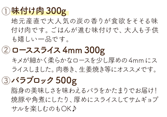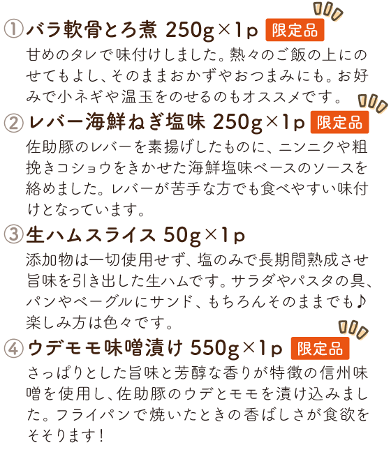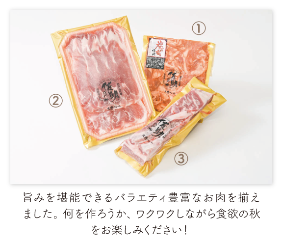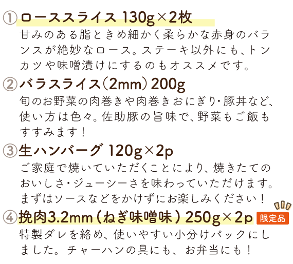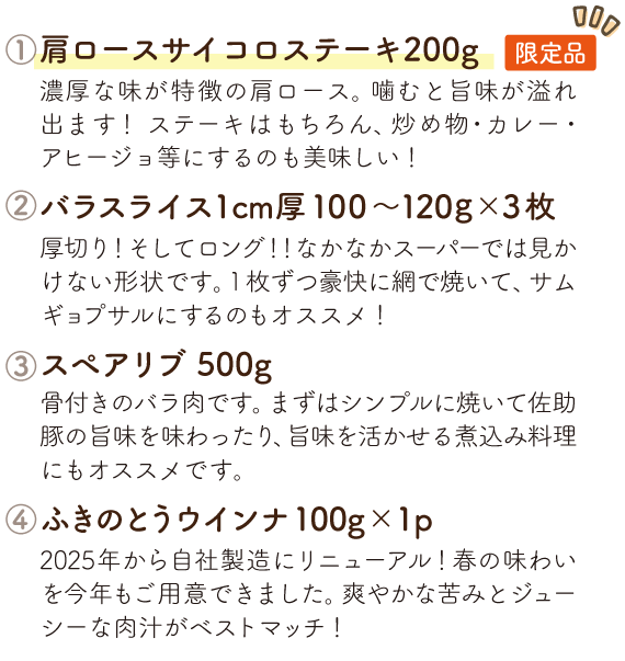 ファーム直送ならではのバラエティ豊かな商品を、毎月お届けします。日常づかいはもちろん、レジャーに、ホームパーティーに、お弁当にと、さまざまなシーンで佐助豚の美味しさを堪能してください。