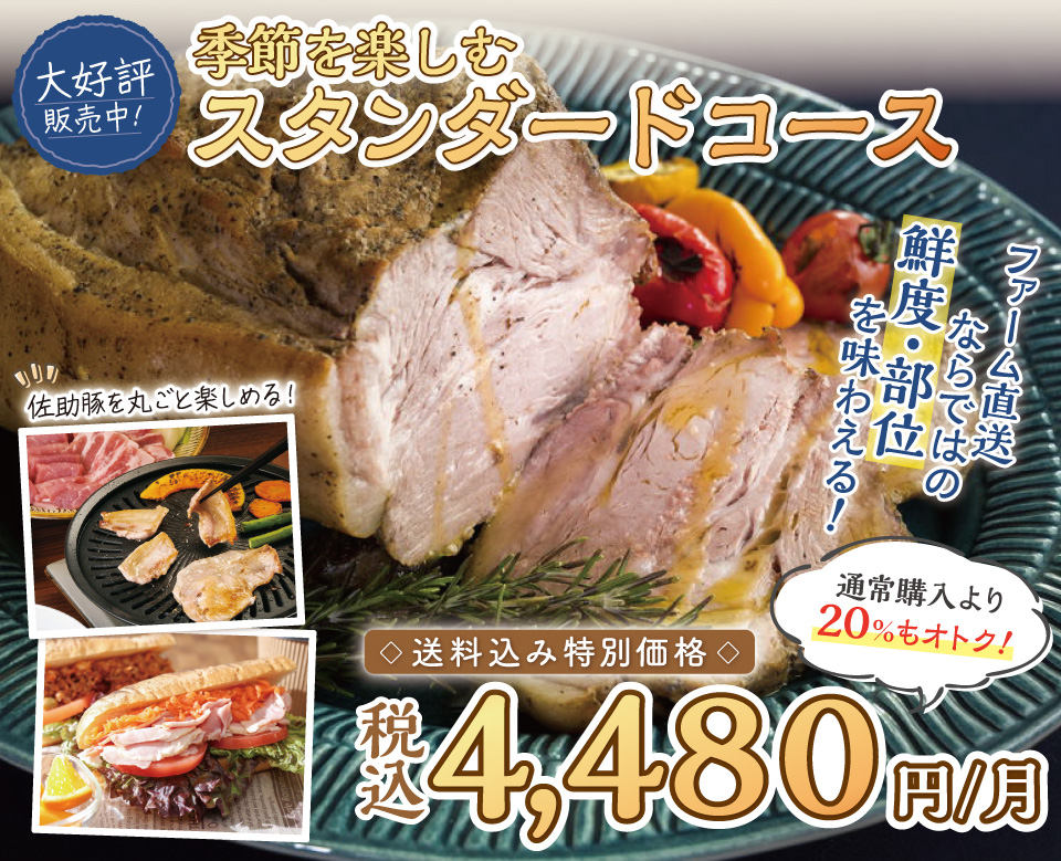 春の行楽、夏のバーベキューなど、それぞれの月に訪れるイベントや季節感に合わせて商品をセレクト。一度も冷凍処理をしていないフレッシュな精肉がメインで、それぞれの部位の味わいを楽しめます。ウインナやベーコン、ミートパイやキッシュなど、素材を生かした加工品も充実。佐助豚の美味しさを、いろいろな角度から味わい尽くせるコースです。各月の商品を通常購入するよりも約20%オトクになるセットが毎月届きます!